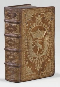 LYCOSTHENES (Conrad). Apophthegmata ex probatis Graecae Latinaeque lingueae scriptoribus. S.l. [Genève], Jacob Stoer, 1616. 2 parties en un fort volume in-8,veau fauve, filets roulettes en encadrement et coinçons de fers filigranés, grandes armoiries au centre cernées par une dentelle de petits fers, dos orné, tranches dorées (Reliure de l'époque).
