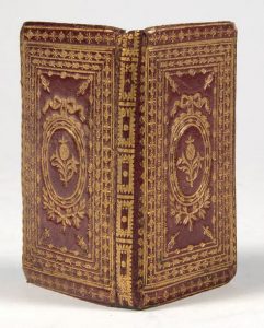 RELIURE. — Objet de dévotion en forme de livre. XVIIIe siècle. Petit in-12 (environ105 x 55 mm), maroquin rouge, large encadrement de multiples filets et roulettes dorés, au centre médaillon ovale suspendu par un nœud de ruban et orné en son milieu d'un fer floral représentant un chardon stylisé, petit fleuron aux angles, dos lisse orné en long, mince roulette intérieure, doublure de papier doré d'Augsbourg (reliure de la fin du XVIIIe siècle).