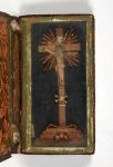 Très curieux objet de dévotion en forme de livre, la reliure recouvrant un petit autel portatif représentant une Crucifixion sous verre.