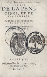 VIGENÈRE (Blaise de). Traicté de la pénitence et de ses parties. Chaalons, De l'Impression de Claude Guyot, 1602. In-8, vélin souple à recouvrement, titre manuscrit au dos (Reliure de l'époque).