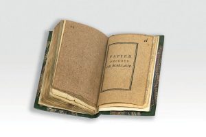 Exemplaire imprimé sur papier de guimauve, bien complet des 20 feuillets d'échantillons de papier végétal fabriqué à partir d'ortie, de roseaux, mousse, racines de chiendent, feuilles de chardon, écorce de saule, tilleul, chêne, etc.