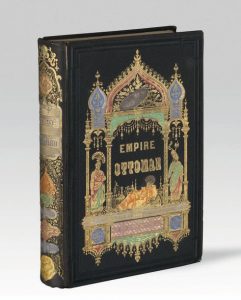 LAVALLÉE (Théophile). Histoire de l'empire Ottoman depuis l'état ancien jusqu'à nos jours. Paris, Garnier, 1855. Grand in-8, plaque mosaïquée représentant un pacha avec 2 janissaires dans un encadrement arabisant, dos orné, sur le second plat fleuron doré au dromadaire (Cartonnage de l'éditeur).