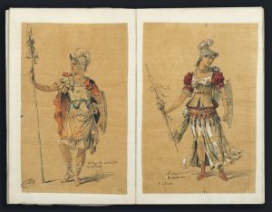 Album de 34 dessins originaux en noir et à l'aquarelle sur papier calque par Eugène Lacoste (1818-1907), peintre et dessinateur de costume pour le théâtre de l'Opéra : 16 dessins de costumes pour Severo Torelli, pièce de François Coppée représentée au théâtre de l'Odéon en 1883, et 18 pour le Songe d'une nuit d'été, représentée en 1886, toujours au théâtre de l'Odéon.