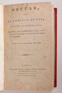 [Ces 5 oeuvres sont précédées de :] DUCIS. Abufar, ou la Famille arabe. Tragédie en quatre actes [...]. Paris, Barba, an troisième. v, [1], 79 pp. [éd. originale] CHENIER (Marie-Josèphe). Caius Gracchus, Tragédie en trois actes [...] Paris, Moutard, 1793. 39 pp. DUCIS. Othello ou le More de Venise, tragédie. [...]. Paris, Maradan, l'an second de la République. 70 [2] pp. [mouillure]. LEFRANC. Didon, tragédie en cinq actes et en vers. [...]. Paris, Fages, an X (1801). 36 pp. LEFEVRE. Don Carlos, tragédie en cinq actes et en vers. [...] Paris, Gabriel Dufour, 1821. Faux-titre, titre, [2], 3, [1], 81, 1 bl, [1] pp. LEMERCIER. Charlemagne, tragédie en cinq actes [...] Paris, Barba, 1816. 112 pp. LEMERCIER. Frédégonde et Brunéhaut, tragédie en cinq actes. [...] Paris, J.-N. Barba, 1821. XX, 83, 1 bl, [4] pp. La Mort de Louis XVI, tragédie. Paris, les Marchands de Nouveautés, 1793. 32 pp. [Edition originale, très rare ; papier uniformément roussi].