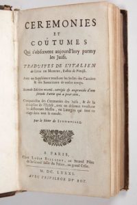 SIMONVILLE (Sieur de), MODENE (Léon de) : Cérémonies et Coûtumes qui s'observent aujourd'huy parmy les Juifs. Traduites de l'italien de Léon de Modène, Rabbin de Venise. Avec un Supplément touchant les Sectes des Caraïtes & des Samaritains de nostre temps. Seconde édition revüe, corrigée & augmentée d'une seconde partie qui a pour titre, Comparaison des Ceremonies des Juifs, & de la discipline de l'Eglise, avec un discours touchant les différentes Messes, ou Liturgies qui sont en usage dans tout le monde. Paris, Loüis Billaine, 1681. Un volume.