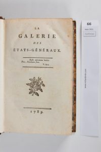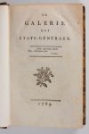 1 [RIVAROL (Antoine de) & MIRABEAU (Honoré Gabriel Riquetti Comte de) & CHODERLOS DE LACLOS (Pierre-Ambroise-François) & LA ROCHE DU MAINE, MARQUIS DE LUCHET (Jean-Pierre-Louis de)]. La Galerie des Etats-Généraux. Sans lieu, sans nom, 1789. In-8° de 204 pp. [annotations manuscrites de l'époque rognées court]. 2 LAURAGUAIS (Le comte de). Dissertation sur les Assemblées nationales ; sous les trois races des rois de France. Paris, sans nom, 10 octobre 1788. 103 pp. [Mouillure]. 3 L'AVERDY (Clément-Charles-François de). Preuves de la pleine souveraineté du Roi, sur la province de Bretagne. Paris, sans nom, 1765. 166 pp. 4 CORDIER (Edmond). Français, expliquons-nous. [Paris], Roblot, sans date [ca. 1797]. 13 pp. 5 CORDIER DE SAINT-FIRMIN. Exposé fidèle des manoeuvres de plusieurs séditieux ; sous le faux prétexte de se saisir de l'Abbé Roy. Sans lieu ni nom, [1789]. 14 pp. 6 Voyages de George III, à Cheltenham, Glocester, Worcester, et leurs environs ; précédés d'une notice historique sur la vie de ce prince. Paris, Planchet, 1823. 203 pages.Table manuscrite sur la 1ère p. de garde.