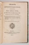 Charte constitutionnelle présentée par Louis XVIII, au sénat et au corps législatif. Discours du Roi et du chancelier. Déclaration et Ordonnance du Roi. - Adresses de la Chambre des Pairs, de la Chambre des Députés des Départemens au Roi, et Réponses du Roi à ces deux Corps. Suivie de la Liste officielle des Membres de la Chambre des Pairs. Paris, Janet et Cotelle, 1814. Un fascicule.