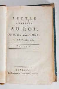 CALONNE (Charles-Alexandre de) : Lettre adressée au Roi, le 9 Février 1789. Londres Spilsbury sans date [1789]. Un volume.