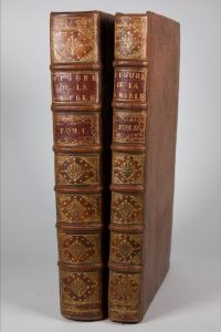 25,5 par 41,5 cm. Frontispice-(12)-282-(8) pages et 141 planches ; frontispice-(22)-154-20 pages et 73 planches. Beau papier. Complet des 214 planches légendées en hollandais et en français, mais sans les 5 cartes. Pleine reliure d'époque, dos 6 nerfs, caissons richement ornés, pièces de titre rouges. Très bon état de la reliure (traces de restauration ancienne). Gravures très contrastées, bien que l'exemplaire soit du second tirage, dit « avec clous » de la gravure 73 du tome 2. Très bon état intérieur, malgré quelques feuillets renforcés en marge, et une page avec un petit manque de texte sur une dizaine de lignes.