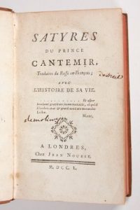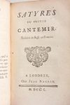 KANTEMIR (Antioh Dmitrievi) : Satyres du prince Cantemir, traduites du russe en françois; avec l'histoire de sa vie. Londres, Jean Nourse, 1750. Un volume.