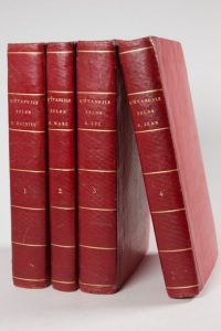 15 par 24,5 cm. Demi-chagrin strié rouge d'époque, dos lisse avec filets et titre à l'or. Parfait état hormis quelques petits trous de ver discrets dans les dos. Quelques rousseurs. Quelques gravures sont tirées sur chine et collées sur du papier fort, celui-ci a bruni.