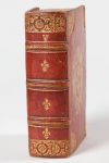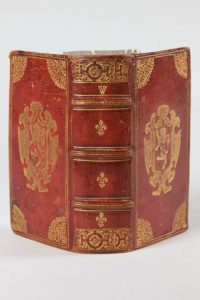 Plein maroquin rouge d'époque, plats encadré d'un double filet doré, avec motifs de feuillage aux écoinçons. Armes au centre des plats de Gaspard BOUFFIER avocat général du Parlement de Grenoble de 1629 à 1663, procureur au Sénat de Savoie. Dos à trois nerfs, décors en haut et bas du dos, fleurs de lys, doré trois tranches. Reliure attribuée à l'atelier de Jean PILLEHOTTE.