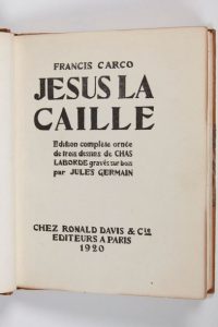 CARCO (Francis) : JESUS La Caille. Edition complète ornée de trois dessins de Chas LABORDE gravés sur bois par Jules Germain. Paris, Ronald Davis & Cie, 1920. Un volume.