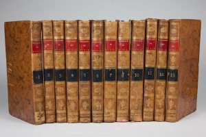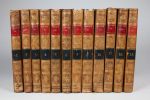 11,5 par 20 cm pour les 12 volumes de textes, 18,5 par 25 cm pour l'Atlas. Manque le tome 9 du texte. Pleine basane marbrée d'époque, dos lisse, pièce de titre noir et rouge pour le texte, pleine basane d'époque dos lisse pièce de titre rouge pour l'Atlas. Menus défauts sur les reliures (frottements, petites épidermures, coiffes usées, petite fente sur 3 cm sur un mors de l'atlas). Un volume avec une mouillure claire.