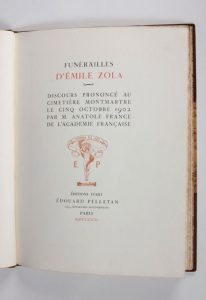 FRANCE (Anatole) : Funérailles d'Émile Zola. Discours prononcé au cimetière Montmartre le cinq octobre 1902 par M. Anatole France de l'Académie française. Paris, Édouard Pelletan, 1902. Un volume.