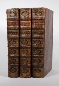 23,5 par 35,5 cm. (10)-859-(18) (mouillure claire en marge haute d'une soixantaine de pages) ; (8)-808-(19) (une page de table avec un manque de papier en marge sans manque, deux petits trous en marge, toujours dans la table) ; (12)-1011-(23) pages (petit trou en marge des pages d'errata). Plein veau d'époque, dos 6 nerfs, caissons ornés, pièce de titre fauve. Nombreux petits défauts n'altérant ni la beauté de l'ouvrage, ni sa solidité.