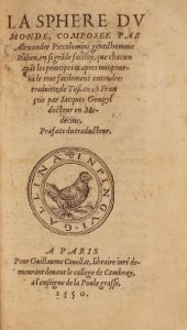 PICCOLOMINI (Alessandro). La Sphère du monde. Paris, Guillaume Cavellat, 1550. In-8, veau brun, …