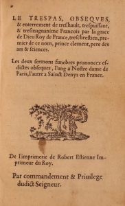 Cette relation des obsèques de François Ier donne notamment les deux oraisons funèbres prononcées à Notre-Dame de Paris et à la basilique Saint-Denis.