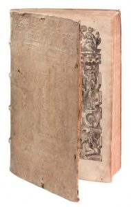 Très bel exemplaire dans une élégante reliure germanique en peau de truie estampée dont le décor présente une roulette allégorique aux effigies de Justicia, Prudentia, Superbia et Lucrecia.