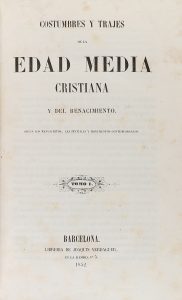 .1852.. LIBRO: .(HISTORIA-MODA).. .COSTUMBRES Y TRAJES DE LA EDAD MEDIA CRISTIANA Y DEL RENACIMIENTO. Según los manuscritos, las pinturas y monumentos contemporáneos.. Barcelona: Imp. de J. Verdaguer, 1852-1853. Dos tomos en 1 vol. en 4º menor. I:...