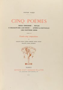 .1902.. LIBRO: .(BIBLIOFILIA).. .HUGO, VICTOR:. .CINQ POEMES: BOOZ ENDORMI - BIVAR O SALDATS DE L´AN DEUX! - APRES LA BATAILLE - LES PAUVRES GENS.. Paris: Editions d´Art Edouard Pelletan, 1902. 4º. 71 p., 3 h. Esporádicas manchas de óxido. 35...