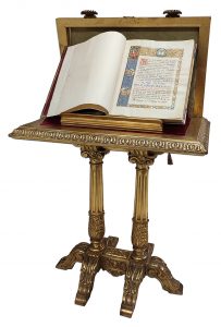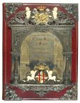 una bella orla floral y medallones que contienen vistas del ayuntamiento de Barcelona, va firmada por A. Flos. Esta página recoge la dedicatoria que los empleados del ayuntamiento de Barcelona, presididos por el propio alcalde, dirigen al secretario Claudio Planas como homenaje por su trabajo diligente y modélico como servidor público. La entrega de este obsequio tuvo lugar en el salón de la Reina María Cristina de la Casa Consistorial de Barcelona el 17 de mayo de 1929. En el mismo acto el alcalde de la ciudad, D. Darío Romeo, impuso la medalla del Secretariado local al homenajeado. Extraordinario libro de firmas presentado en una encuadernación firmada por Joyas A. Roig en plena piel, hilos dorados, cantos y cejas, cortes dorados y con una composición en plata repujada. El plano anterior presenta decoración en plata formando un frontis arquitectónico que contiene la leyenda ´Al Iltre. Sr. D. Claudio...´, debajo dos angelotes de marfil sostienen el escudo de Barcelona y en lo alto otros dos angelotes sustentan otra leyenda ´Fe Administrativa´ en corona de laurel y con corona real. En el plano posterior un medallón de plata lleva grabada la fecha 1929. Refuerzos de plata en las puntas, que en el plano anterior llevan una piedra azul pulida. Las guardas son de seda. La obra va acompañada de una urna expositor de vidrio y madera cerrada con llave, el atril del interior forrado de terciopelo rojo, reposa sobre una peana de dos columnas y seis pies, la madera dorada decorada con volutas.
