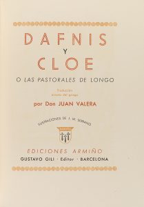 .1940.. LIBRO: .(BIBLIOFILIA).. .VALERA, JUAN y SERRANO, J. M. (ilustr.):. .DAFNIS Y CLOE O LAS PASTORALES DE LONGO.. Barcelona: Ed. Armiño, 1940. 4º menor. 155 p. + 1 h. Con ilustraciones a color de J. M. Serrano. Enc. en pergamino, corte superior...