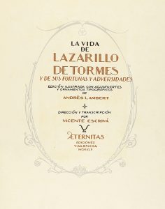 .1942.. LIBRO: .(BIBLIOFILIA-LITERATURA).. .LAMBERT, ANDRES [Ilustr.]:. .LA VIDA DE LAZARILLO DE TORMES y de sus fortunas y adversidades... Dirección y transcripción por Vicente Escrivá.. Valencia: Aeternitas, 1942. 4º mayor. 153 p. Edición...