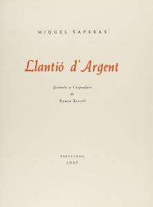 .1947.. LIBRO: .(BIBLIOFILIA).. .SAPERAS, MIQUEL:. .LLANTIÓ D´ARGENT.. Barcelona: Altés, 1947. 4º menor. 150 p. +1 h. 6 aguafuertes de Ramon Borrell, 5 en lámina más uno en texto. Texto enmarcado y a dos tintas. Ejemplar en rama, presentado en...