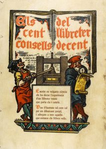 .1947.. LIBRO: .(BIBLIOFILIA).. .[TRIEU I REMENEU, JORDI:].. .ELS CENTS CONSELLS DEL LLIBRETER DECENT. Facècia llibresca en cent rodolins, escrits per (...) Dibuixats per J. Mur. Acolorits a ma, a sis colors plans per Manuel Barragan.. Barcelona:...