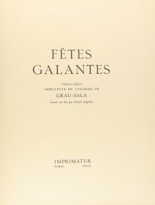 .1953.. LIBRO: .(BIBLIOFILIA).. .VERLAINE, PAUL; GRAU SALA (Ilustr.):. .FETES GALANTES.. París / Nice: Ed. Imprimatur, 1953. Folio menor. 2 h. + 151 p. + 3 h. Ilustr. con 22 láminas de grabados de GRAU SALA impresos por Gérard Angiolini. Cubiertas...