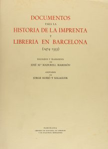 Balaguer. Barcelona: Gremio Editores, Libr. y Maestros Imp., 1955. 4º. 1013 p. Rústica editorial en estuche con puntos de óxido. Intonso y en rama. Editado en conmemoración del IV centenario de la constitución de la Cofradía de Libreros de Barcelona. Palau 280569: ´Es obra fundamental y las anotaciones de Rubió son un verdadero tratado exhaustivo de todo el material de que disponemos para una historia de los inicios barceloneses de la librería e imprenta´.