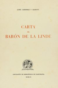 .1959.. LIBRO: .(BIBLIOFILIA).. .CARESMAR Y ALEMANY, JAIME:. .CARTA AL BARON DE LA LINDE. Sobre la antigua y nueva población de Cataluña. Intr. Juan Reglá.. Barcelona: Asociación de Bibliófilos, 1959. 4º mayor. XXXV + 147 p. + 4 h. Texto a dos...