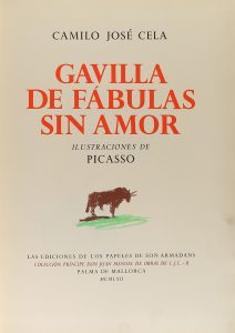 3 h. blancas. Ilustr. con dibujos de Picasso realizados expresamente para esta edición e impresos bajo la dirección de Jaume Pla. Enc. en arpillera edit. Edición numerada de 2000 ejemplares sobre papel Picasso, que se emplea por primera vez, fabricado por la Casa Guarro con la doble filigrana del sol y las gavillas, de un total de 2135. Con la firma manuscrita de Cela.