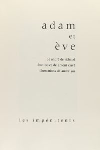 .1967.. LIBRO: .(ARTE-BIBLIOFILIA).. .RICHAUD, ANDRÉ DE; CLAVÉ, ANTONI; GAS, ANDRÉ:. .ADAM ET ÈVE.. Paris: Les Impénitents, 1967. 4º mayor. 7 h. + 65 p. + 5 h. Frontis grabado por CLAVÉ, 11 aguatintas, 2 grabados al boj y 6 viñetas por André...