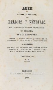.1847.. LIBRO: .(RELOJERÍA).. .BERTHOUD, F.:. .ARTE DE CUIDAR Y REGULAR LOS RELOJES Y PÉNDULOS PARA USO DE LOS QUE NO TIENEN NINGUNA NOCION DE RELOJERÍA.. Figueras: Imp. F. Oliveras i Colomer, 1847. 8º mayor. 3 h. + 124 p. + 1 h. + 1 lám....