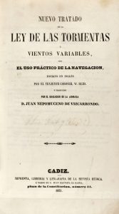VIZCARRONDO.. Cádiz: Imprenta, Librería y Litografía de la Revista Médica, a cargo de D. Juan Bautista de Gaona, 1853. 4º menor. 4 h. + 461 p. Profus. ilustr. con mapas, figuras y estados en el texto y 6 mapas, 3 de ellos plegados fuera de texto. Primera y última p. remarginadas. El Tratado comienza con una explicación general de la ley por la cual se rigen las tormentas, seguido de unas reflexiones de Mr. Redfield acerca de las grandes oscilaciones del barómetro. Obra fundamental para los navegantes transoceánicos desde mediados hasta finales del siglo XIX, gozando de amplia popularidad entre los marinos. Incluso, y a falta de tratados más completos, siguió utilizándose hasta principios del s. XX (ca. 1.920) que cayó en desuso. Enc. en plena piel, corte superior dorado; lomera y cantos algo rozados, cajos parcialmente sesgados. Palau. 256563.
