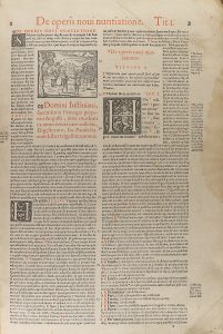 h. (de 16). Texto a dos columnas, a dos tintas. Tipografía itálica y griega. Tres cuerpos de letra, uno para el texto de Justiniano, otro para los comentarios y el tercero para las apostillas marginales. Lleva xilografías en el texo y capitales también xilografiadas. Lleva abundantes anotaciones manuscritas en los márgenes. Contiene los libros XXXIX a L. Además de haber perdido hojas tiene cerco de humedad y galerías al final de la obra. Los comentarios y aproximación al texto original de Justiniano son un trabajo del jurista alemán Gregorio Haloandro. Enc. en pergamino de época.
