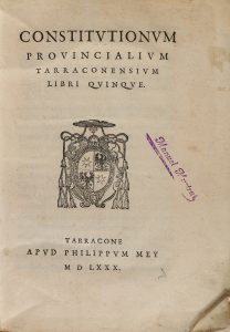 CONCILII PROVINCIALIS TARRACONENSIS. .Id., 1585 (escrito MDXXCV). 2 h. + 27 p. Con anotaciones marginales de época. Sellos húmedos de anterior propietario. Enc. en un vol. en pergamino de época. Alguna hoja tostada. Primera edición. Palau 60317 indica como la primera edición la de 1581, cuando en realidad la que ofrecemos es anterior y con diferente paginación. Antonio Agustín fue un humanista nacido en Zaragoza en 1516 y murió en Tarragona en 1576. Esta obra contiene las reglas de los diferentes concilios celebrados en Tarragona, que a la práctica organizaban la vida social y eclesiástica de la zona. Contiene directivas sobre los usos, la economía, el comercio, la alimentación, sortilegios, judíos, árabes... Filólogo, numismático, historiador del derecho romano, aportó al estudio del derecho romano canónico todas las fuentes del humanismo jurídico, de las que él fue uno de los mejores intérpretes.