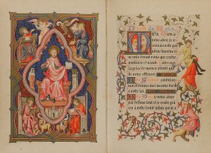 y viñetas policromas y dorados, de fina belleza. Bella enc. tafilete incoloro con mosaico en tres bandas en azul y rojo y remaches metálicos, cortes dorados; cajos ligeramente rozados. Dibujos de Ledoux, Seltau y Cofettier, ejecutados por Moulin. Estos libros de horas realizados por Gruel & Engelmann se popularizaron durante el s. XIX y podían ser muy variados, pero siempre tomando como ejemplo los manuscritos de la biblioteca real.