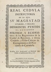 .1718.. FOLLETO: .(CATALUNYA-DERECHO).. .[FELIPE V].. .REAL CEDULA INSTRUCTORIA EN LA QUAL SU MAGESTAD ESTABLECE, Y DECLARA DIFERENTES PUNTOS AL GOVIERNO POLITICO, Y ECONOMICO DE LOS REGIMIENTOS DE LA CIUDAD DE BARCELONA, Y DEMÀS CIUDADES, Y VILLAS...