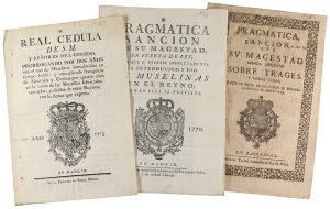 Portada con escudo y orla xilográfica + 19 p. con el texto de la pragmática que regula la moderación en el vestir y los gastos supérfluos como las guarniciones de las carrocerías. Publicada por primera vez en 1691. [Más:] .PRAGMATICA SANCION DE SU MAGESTAD, EN FUERZA DE LEY, POR LA QUE SE PROHIBE ABSOLUTAMENTE LA INTRODUCCION Y USO DE MUSELINAS EN EL REYNO, SEGUN EN ELLA SE PREVIENE. .Madrid: Imp. Antonio Sanz, 1770. 4º. Portada con escudo xilográfico. 6 p. Papel muy blanco. Para proteger el comercio de tela interior, esta ley prohibe la importación de muselinas y tejidos decorados provenientes de Asia, África y de imitación europeos, con pena económica y destrucción del género.[Más:] .REAL CEDULA DE S. M... PRORROGANDO POR DOS AÑOS MAS EL USO DE MUSELINAS INTRODUCIDAS EN TIEMPO HABIL; Y CONCEDIENDO FRANQUICIA DE ALCAVALAS Y CIENTOS POR QUATRO AÑOS EN LA VENTA DE LAS MANTILLAS FABRICADAS CON TELAS, Y EFECTOS DE ESTOS REYNOS, CON LO DEMAS QUE EXPRESA. .Madrid: Imp. Pedro Marin, 1773. 4º. 4 h. Portada con escudo. Tres documentos relativos al comercio de telas y regulación de su uso. Todos con marcas de punzón de haber estado cosidos.