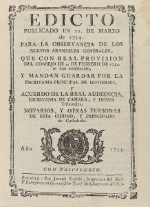 .1734.. FOLLETO: .(BARCELONA-COMERCIO).. .EDICTO PUBLICADO EN 22 DE MARZO DE 1734 PARA LA OBSERVANCIA DE LOS NUEVOS ARANZELES GENERALES, QUE CON REAL PROVISION DEL CONSEJO DE 4 DE FEBRERO DE 1734 SE HAN ESTABLECIDO, Y MANDAN GUARDAR POR LA ESCRIVANIA...