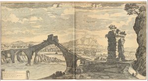 .1680 ca.. GRABADO: .(MARTORELL).. .BRUCTE ZU CATALONIEN BEN DEM STADTS MATORELI.. 34 x 64 cm. Vista del río Llobregat desde el puente del Diablo en Martorell, con Montserrat al fondo. [Más:] .MOULINIER y DEQUEVAUVILLER: VISTA PINTORESCA DEL PUENTE...