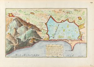.1695 ca.. GRABADO: .(BARCELONA).. .INSELIN:. .BARCELONNE Ville et port fameux d´Espagne, capitale de la principauté de Catalogne.... Grabado al cobre y coloreado, con la firma en plancha. 17 x 28 cm huella y 23 x 32 cm papel. Cat. Solery 69.