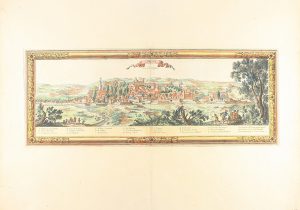 .1700 ca.. GRABADO: .(GIRONA).. .[PERELLE, N.]:. .GIRONE EN CATALOGNE.. 21 x 55 cm huella, sobrepuesto en gran hoja de 46 x 64 cm. Grabado al cobre, coloreado. Vista de la ciudad de Girona con leyenda explicativa de sus principales edificios. Papel...