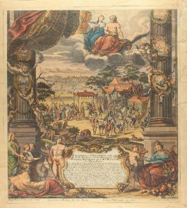 enmarcada en orla arquitectónica del recibimiento de la princesa Elisabet Cristina Brunswick-Wolfenbüttel, esposa de Carlos VI y pretendiente al trono de España por la casa de Hausburgo. Bien coloreado. Restauraciones marginales.