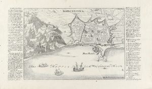 .1725 ca.. GRABADO: .(BARCELONA).. .STRIDBECK, IOH.; [BODENEHR, GABRIEL]:. .BARCELONA.. Plano de la ciudad de Barcelona con una columna de texto a cada lado de la imagen. 15 x 27,5 cm huella, 19 x 32 cm papel. Cat. Solery 162A .