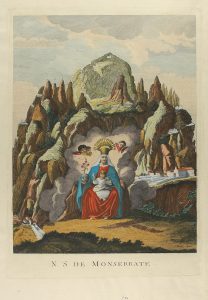 explicativo en plancha.[Más:] .N. S. DE MONSERRATE. .38 x 27,5 cm huella y 43 x 30,5 cm papel. Grabado coloreado de la Montaña y la virgen con el niño.
