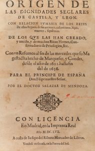.1657.. LIBRO: .(HISTORIA).. .SALAZAR DE MENDOZA, [PEDRO]:. .ORIGEN DE LAS DIGNIDADES SEGLARES DE CASTILLA Y LEON CON RELAÇION SUMMARIA DE LOS REYES DE ESTOS REYNOS: DE SUS ACTIONES: CASAMIENTOS: HIJOS: MUERES: SEPULTURAS.... Madrid: Imp. Real, a...